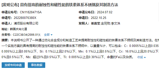 2024年7月2日,浦項(xiàng)股份有限公司成功申請(qǐng)一項(xiàng)名為“具有提高的耐蝕性和磁性能的鐵素體系不銹鋼及其制造方法”專(zhuān)利,申請(qǐng)公布號(hào)CN118284715A,申請(qǐng)日期為2022年10月25日。